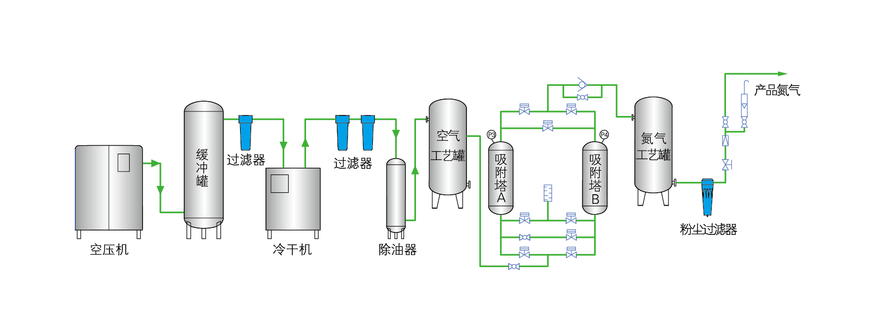 分子筛制氮机(PSA变压吸附制氮机)通常使用双吸附塔工艺结构,通过进气、吸附、产气、均压、脱附、再生六个基本步骤,完成氮氧分离,获得所需不同纯度的氮气。