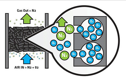 碳分子筛是PSA制氮机上的吸附剂,利用压缩空气中氧、氮分子在碳分子筛中吸附量的差异,通过加压吸附产气,常压脱附再生的原理从压缩空气中直接制取产品氮气的气体分离设备。