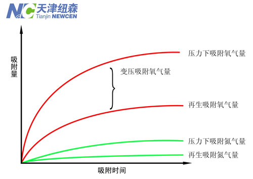 碳分子筛对氧气和氮气在不同的吸附时间和吸附压力下吸附量的变化差异曲线:在空气压力升高时,碳分子筛将大量吸附氧气、二氧化碳和水分。当压力降到常压时,碳分子筛对氧气、二氧化碳和水分的吸附量较小